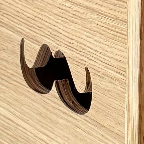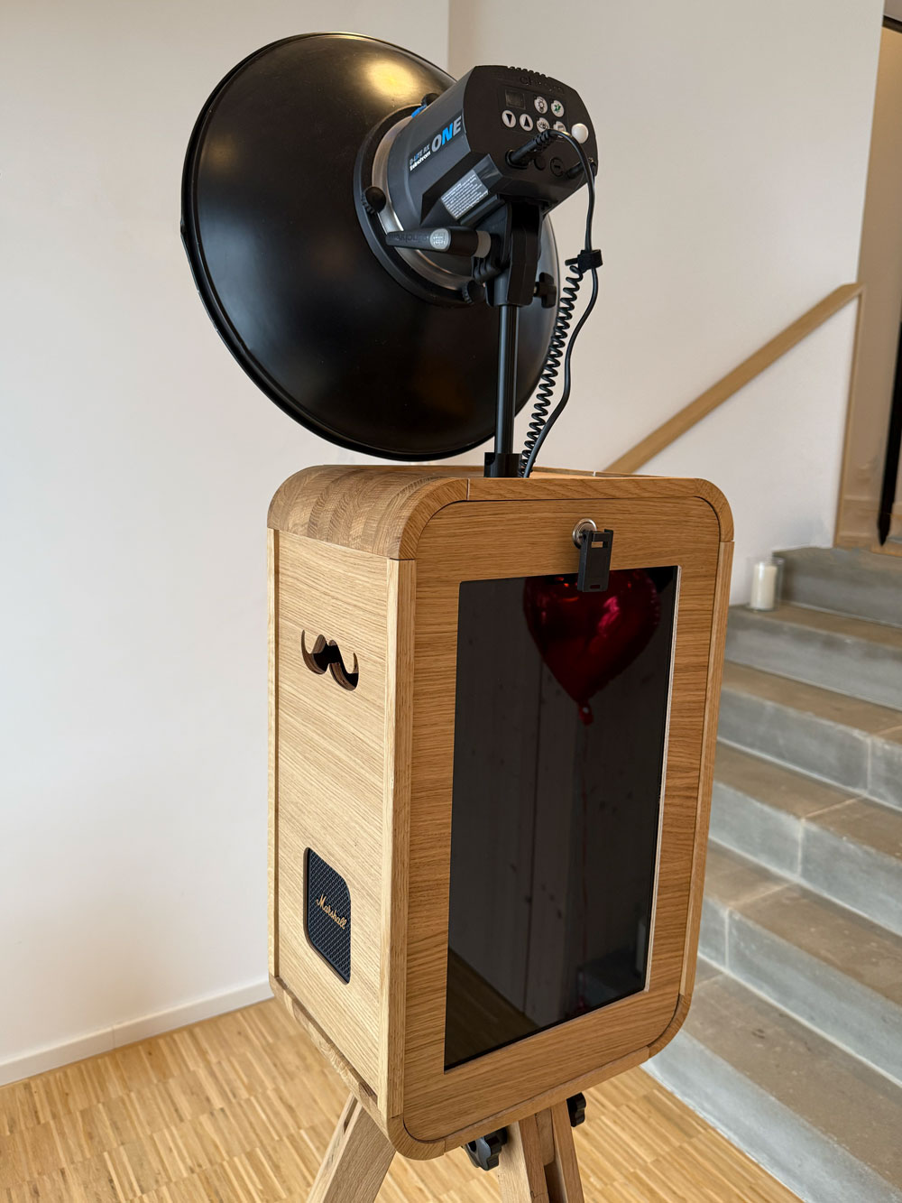 Stative aus Eichenholz und unser typischer Schnurrbart als Griffmulden verleihen der Fotobox Deluxe ihren unverwechselbaren, eleganten Look.
