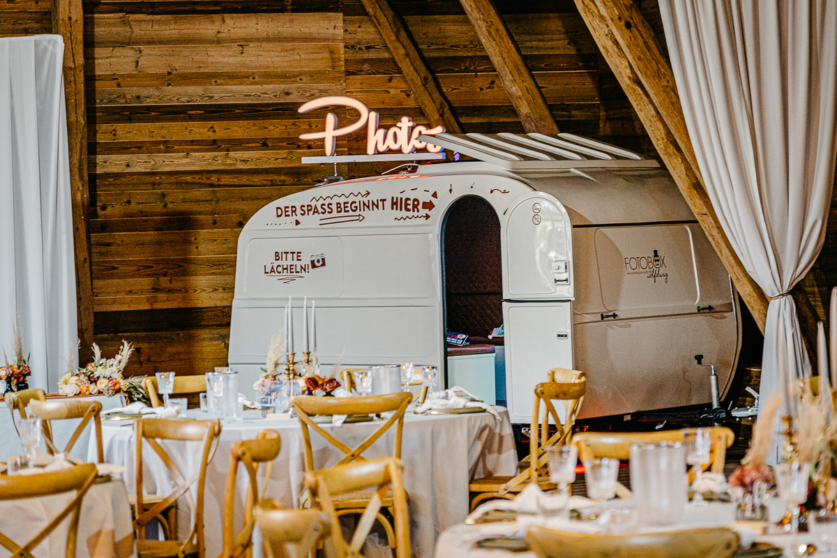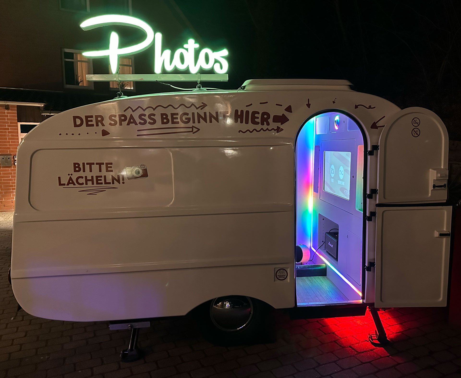 Das große Photos-Schild macht die Fotobox Caravans schon von außen zum Highlight. Für die Tür könnt ihr noch eines unsere LED Schilder passend dazu wählen. Unsere LOVE Buchstaben sind auch eine tolle Ergänzung für unsere Fotobox Caravans.
