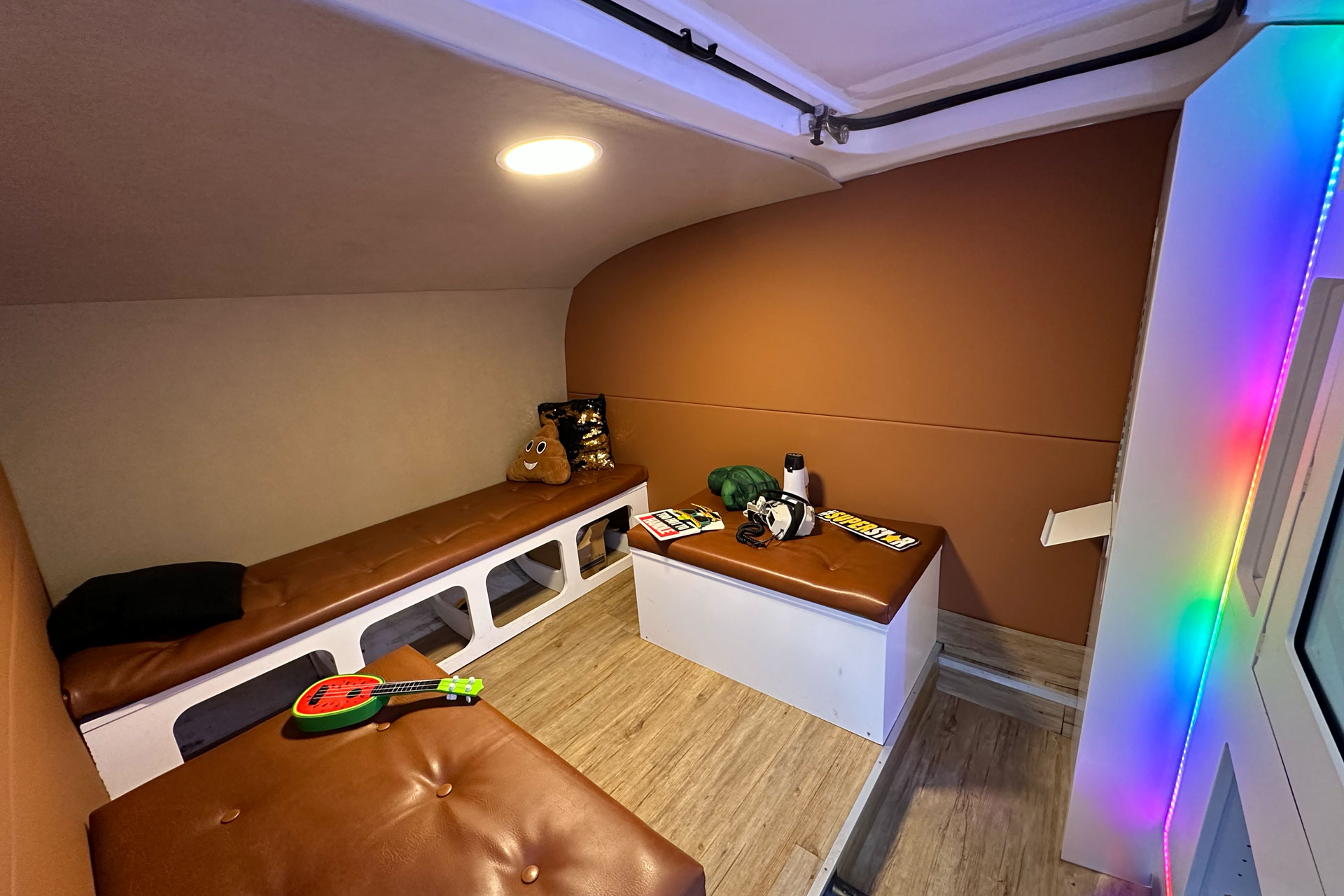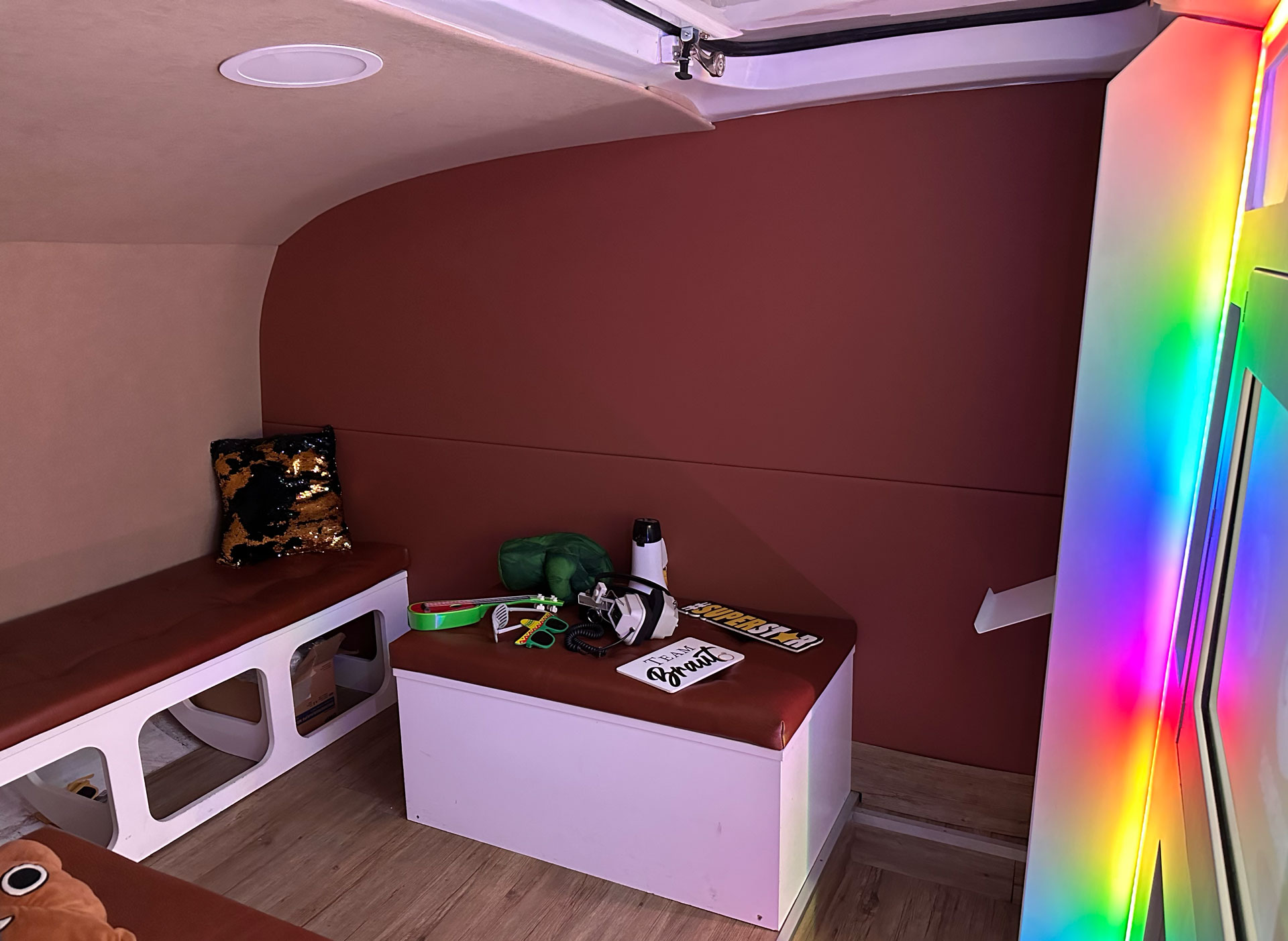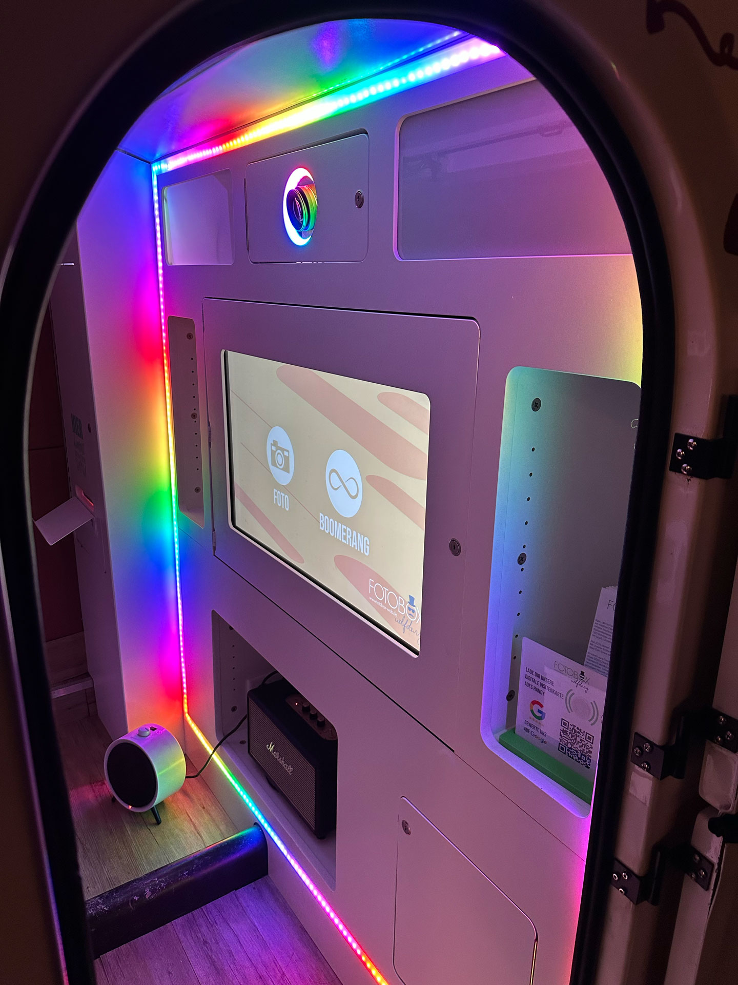 In unseren beiden Retro Wohnwagen aus den 80ern befindet sich neuste Technik: coole LED Beleuchtung, eine Soundanlage, ein großer Touchscreen Monitor, eine Spiegelreflexkamera, eine Fotostudio-Blitzanlage und ein professioneller Fotodrucker für blitzschnelle Ausdrucke. Bis zu 10 Leute finden bequem Platz, so dass auch Gruppenfotos problemlos möglich sind.