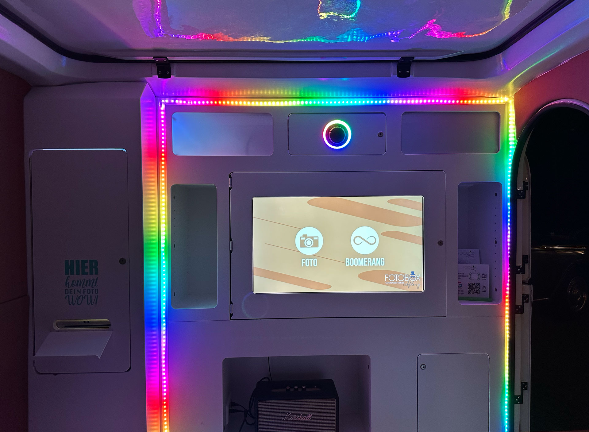 Ausgestattet mit einer hochwertigen Kamera, einem professionellen Fotodrucker, 23′ Touch Monitor (im 2. Caravan sogar 32′!), Hifi-Anlage und LED Beleuchtung sorgt die mobile Fotobox im Caravan für eine Menge Aufsehen auf eurer Veranstaltung.